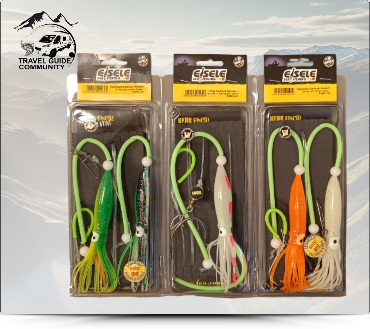 Ein selbstleuchtender und ein pinker Oktopuss sind sehr effektiv, da man somit auf zwei unterschiedliche Lichtverhältnisse gleichzeitig eingestellt ist. Oft lockt der untere Leuchtköder den Fisch an und der pink / ultra-violette Köder wird genommen.